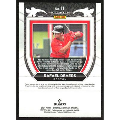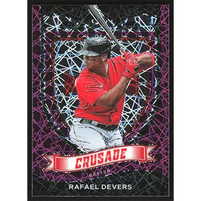 This is a 2021 Panini Chronicles Crusade Purple Velocity Rafael Devers baseball card. The card is #11 and pictures show condition. Team(s): Boston Red Sox