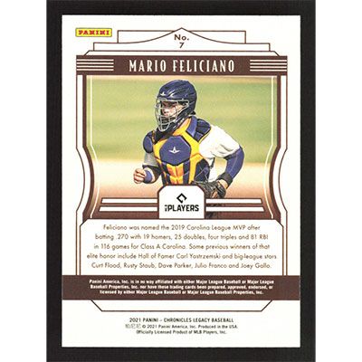 This is a 2021 Panini Chronicles Legacy Mario Feliciano baseball card. The card is #7 and pictures show condition. Team(s): Milwaukee Brewers Rookie Card (RC)