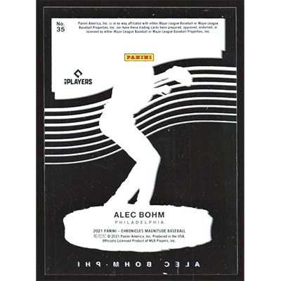 This is a 2021 Panini Chronicles Magnitude Alec Bohm baseball card. The card is #35 and pictures show condition. Team(s): Philadelphia Phillies Rookie Card (RC)