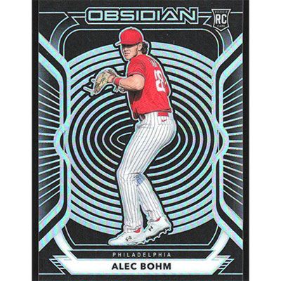 This is a 2021 Panini Chronicles Obsidian Alec Bohm baseball card. The card is #51 and pictures show condition. Team(s): Philadelphia Phillies Rookie Card (RC)