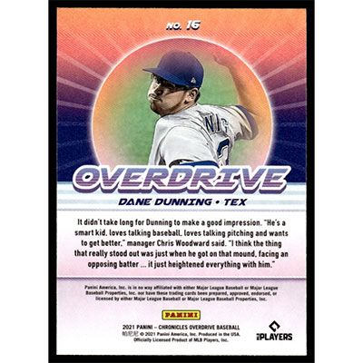 This is a 2021 Panini Chronicles Overdrive Dane Dunning baseball card. The card is #16 and pictures show condition. Team(s): Texas Rangers Rookie Card (RC)