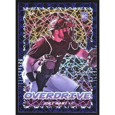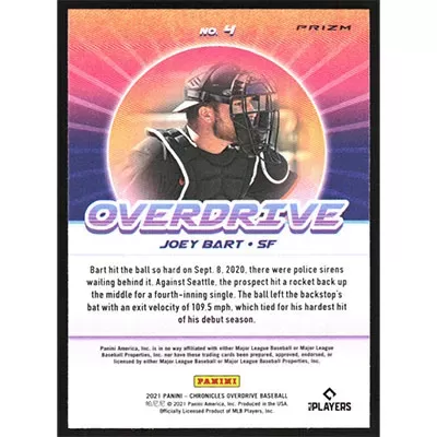 This is a 2021 Panini Chronicles Overdrive Blue Velocity Joey Bart baseball card. The card is #4 and pictures show condition. Team(s): San Francisco Giants Rookie Card (RC)