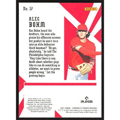 This is a 2021 Panini Chronicles Phoenix Alec Bohm baseball card. The card is #17 and pictures show condition. Team(s): Philadelphia Phillies Rookie Card (RC)