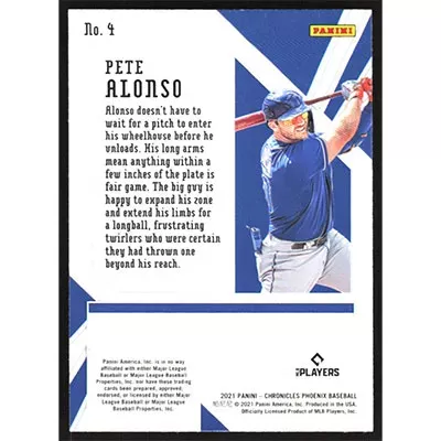 This is a 2021 Panini Chronicles Phoenix Holo Pete Alonso baseball card. The card is #4 and pictures show condition.