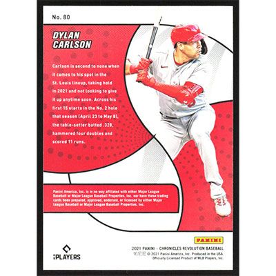 This is a 2021 Panini Chronicles Revolution Dylan Carlson baseball card. The card is #80 and pictures show condition. Team(s): St. Louis Cardinals Rookie Card (RC)