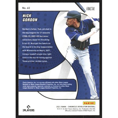 This is a 2021 Panini Chronicles Revolution Fractal Nick Gordon baseball card. The card is #60 and pictures show condition.