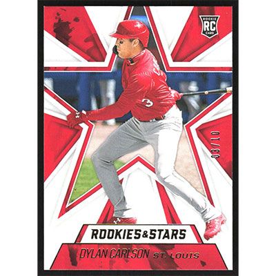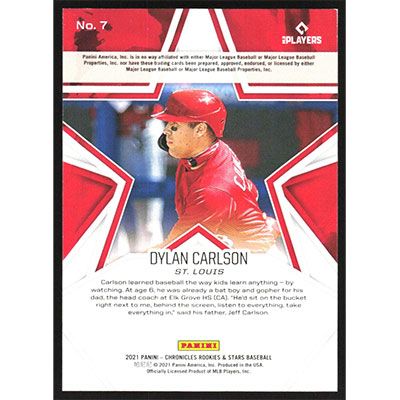 This is a 2021 Panini Chronicles Rookies & Stars Gold Dylan Carlson baseball card. The card is #7 and pictures show condition. This card is limited; #'d 03/10.