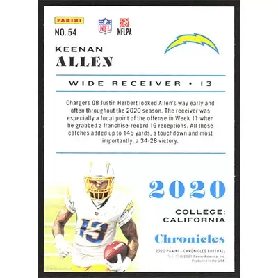 This is a 2021 Panini Chronicles Teal Keenan Allen football card. The card is #54 and pictures show condition.