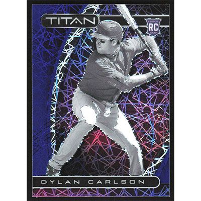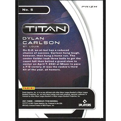 This is a 2021 Panini Chronicles Titan Blue Velocity Dylan Carlson baseball card. The card is #5 and pictures show condition. Team(s): St. Louis Cardinals Rookie Card (RC)
