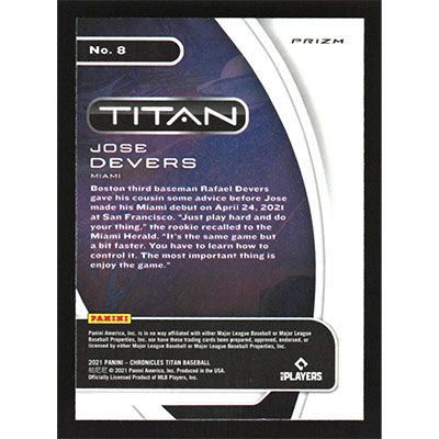 This is a 2021 Panini Chronicles Titan Purple Velocity Jose Devers baseball card. The card is #8 and pictures show condition. Team(s): Miami Marlins Rookie Card (RC)