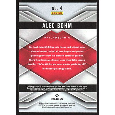 This is a 2021 Panini Chronicles Titanium Alec Bohm baseball card. The card is #4 and pictures show condition. Team(s): Philadelphia Phillies Rookie Card (RC)