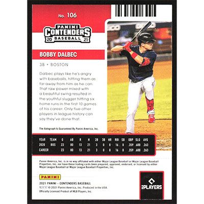 This is a 2021 Panini Contenders Bobby Dalbec autographed baseball card. This card has been signed, in blue, by Bobby Dalbec, and is certified authentic by Panini. The card is #106 and pictures show condition.