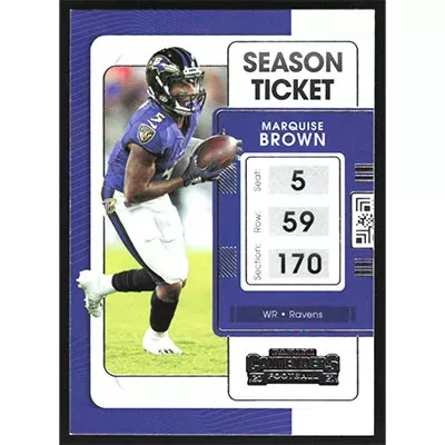This is a 2021 Panini Contenders Marquise Brown football card. The card is #8 and pictures show condition.