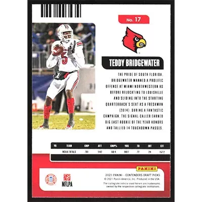 This is a 2021 Panini Contenders Draft Picks Teddy Bridgewater football card. The card is #17 and pictures show condition.
