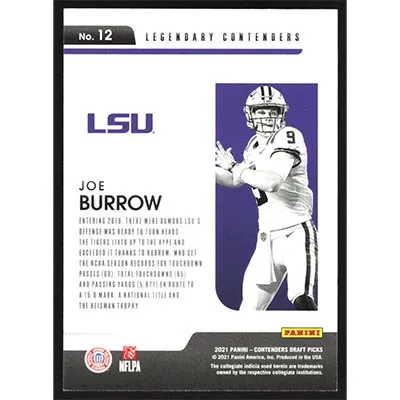 This is a 2021 Panini Contenders Draft Picks Legendary Green Joe Burrow football card. The card is #12 and pictures show condition. This card is limited; #'d 20/49.