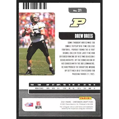 This is a 2021 Panini Contenders Draft Picks Ticket Drew Brees football card. The card is #21 and pictures show condition. Team: Purdue Boilermakers