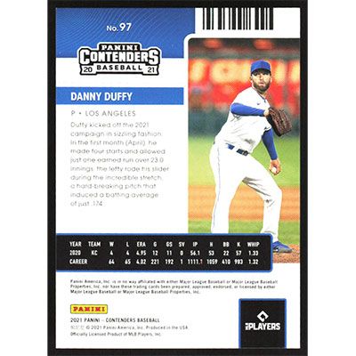 This is a 2021 Panini Contenders Draft Ticket Blue Danny Duffy baseball card. The card is #97 and pictures show condition. This card is limited; #'d 123/149.