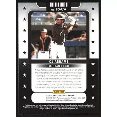 This is a 2021 Panini Contenders Future Stars CJ Abrams baseball card. The card is #FS-CA and pictures show condition.