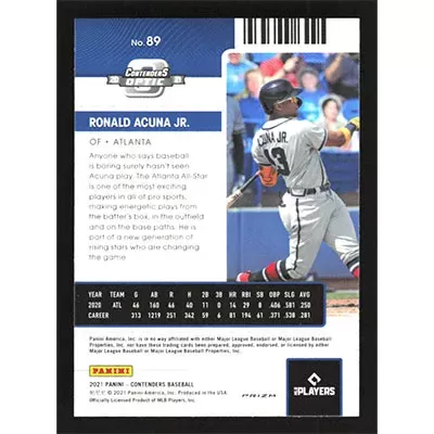 This is a 2021 Panini Contenders Optic Red Wave Ronald Acuña Jr. baseball card. The card is #89 and pictures show condition.