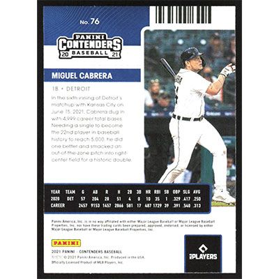 This is a 2021 Panini Contenders Season Ticket Green Miguel Cabrera baseball card. The card is #76 and pictures show condition.