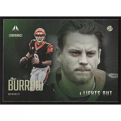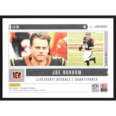 This is a 2021 Panini Luminance Lights Out Joe Burrow football card. The card is #LO-10 and pictures show condition.