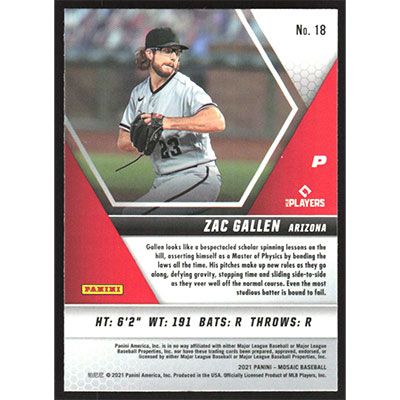 This is a 2021 Panini Mosaic Zac Gallen baseball card. The card is #18 and pictures show condition.