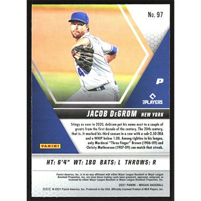This is a 2021 Panini Mosaic Jacob deGrom baseball card. The card is #97 and pictures show condition.