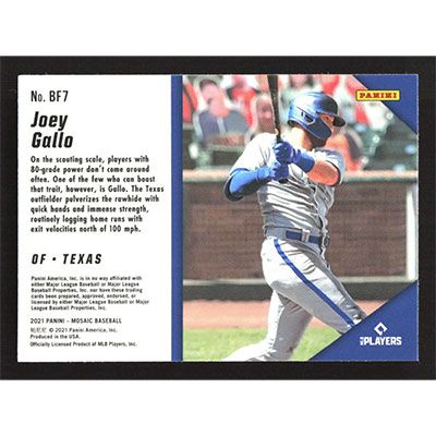 This is a 2021 Panini Mosaic Big Fly Joey Gallo baseball card. The card is #BF7 and pictures show condition.