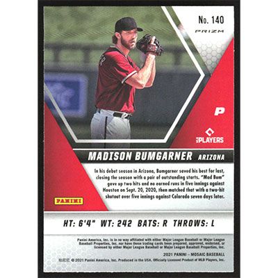 This is a 2021 Panini Mosaic Blue Camo Madison Bumgarner baseball card. The card is #140 and pictures show condition.