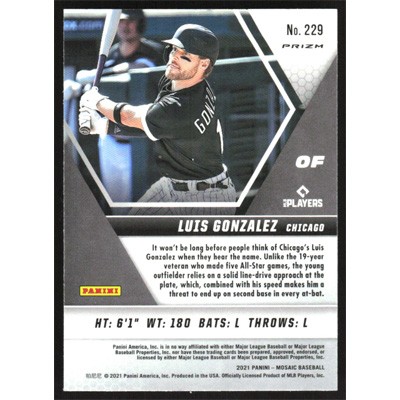 This is a 2021 Panini Mosaic Blue Camo Luis Gonzalez baseball card. The card is #229 and pictures show condition. Team(s): Chicago White Sox Rookie Card (RC)