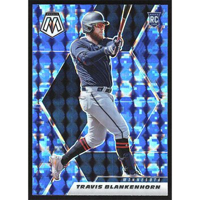 This is a 2021 Panini Mosaic Blue Camo Travis Blankenhorn baseball card. The card is #272 and pictures show condition. Team(s): Minnesota Twins Rookie Card (RC)