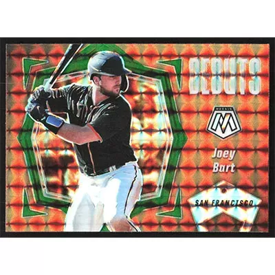 This is a 2021 Panini Mosaic Debuts Green Joey Bart baseball card. The card is #PD3 and pictures show condition.