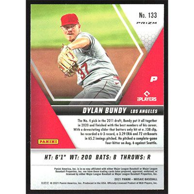 This is a 2021 Panini Mosaic Green Dylan Bundy baseball card. The card is #133 and pictures show condition.