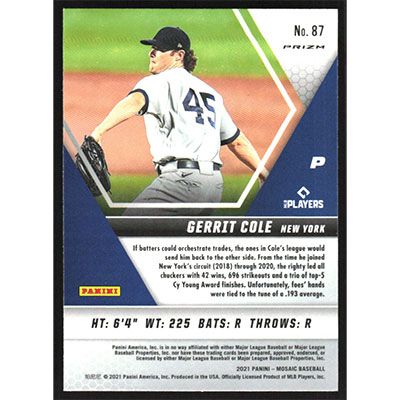 This is a 2021 Panini Mosaic Green Gerrit Cole baseball card. The card is #87 and pictures show condition.