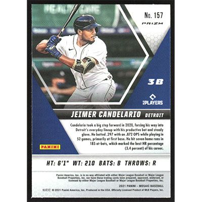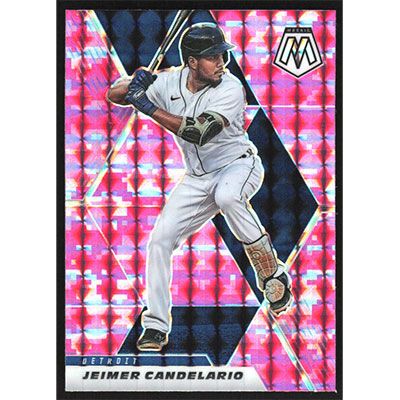 This is a 2021 Panini Mosaic Pink Camo Jeimer Candelario baseball card. The card is #157 and pictures show condition.
