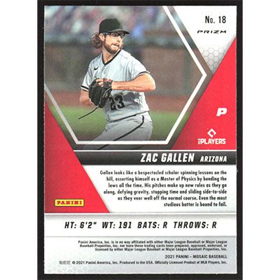 This is a 2021 Panini Mosaic Pink Camo Zac Gallen baseball card. The card is #18 and pictures show condition.