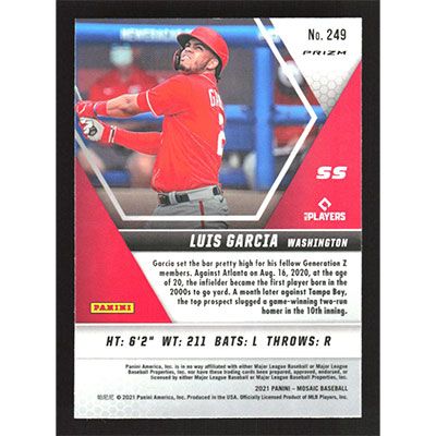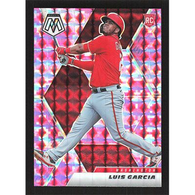 This is a 2021 Panini Mosaic Pink Camo Luis Garcia baseball card. The card is #249 and pictures show condition. Team(s): Washington Nationals Rookie Card (RC)