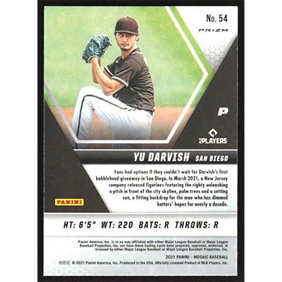 This is a 2021 Panini Mosaic Pink Camo Yu Darvish baseball card. The card is #54 and pictures show condition.
