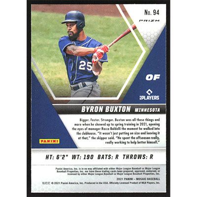 This is a 2021 Panini Mosaic Pink Camo Byron Buxton baseball card. The card is #94 and pictures show condition.