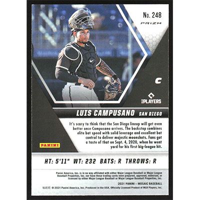 This is a 2021 Panini Mosaic Reactive Blue Luis Campusano baseball card. The card is #248 and pictures show condition. Team(s): San Diego Padres Rookie Card (RC)