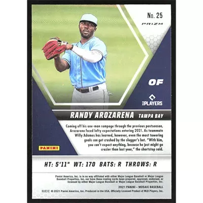 This is a 2021 Panini Mosaic Silver Prizm Randy Arozarena baseball card. The card is #25 and pictures show condition.