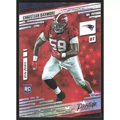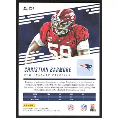 This is a 2021 Panini Prestige Xtra Points Astral Christian Barmore football card. The card is #251 and pictures show condition. Team: New England Patriots Rookie Card