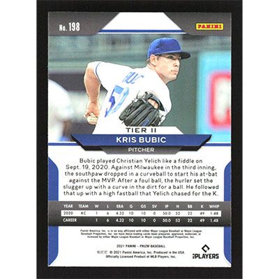 This is a 2021 Panini Prizm Kris Bubic baseball card. The card is #198 and pictures show condition.