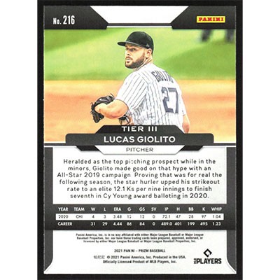 This is a 2021 Panini Prizm Lucas Giolito baseball card. The card is #216 and pictures show condition.