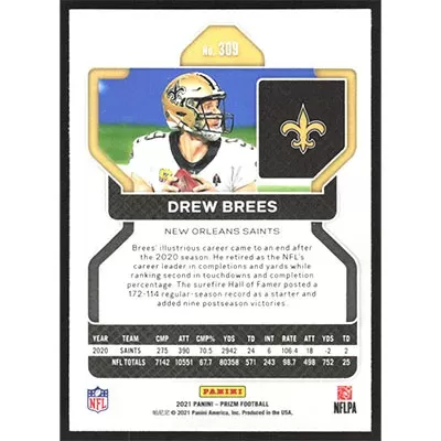 This is a 2021 Panini Prizm Drew Brees football card. The card is #309 and pictures show condition.