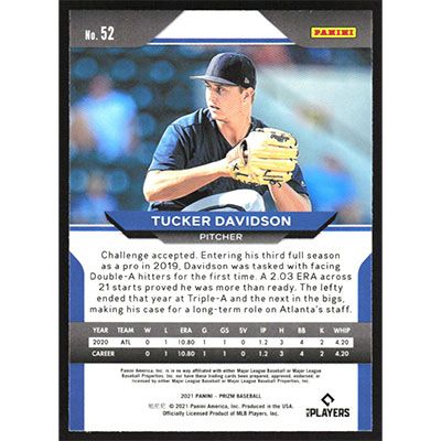 This is a 2021 Panini Prizm Tucker Davidson baseball card. The card is #52 and pictures show condition.