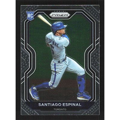 This is a 2021 Panini Prizm Santiago Espinal baseball card. The card is #72 and pictures show condition.