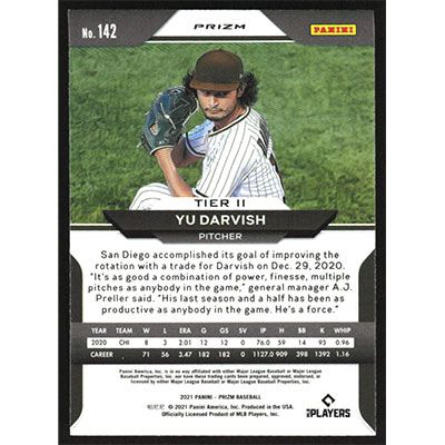 This is a 2021 Panini Prizm Carolina Blue Yu Darvish baseball card. The card is #142 and pictures show condition.