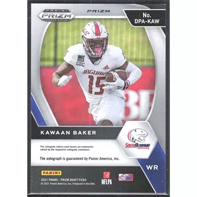This is a 2021 Panini Prizm Draft Picks Autographs Green Kawaan Baker autographed football card. This card has been signed, in blue, by Kawaan Baker, and is certfied authentic by Panini. The card is #DPA-KAW and pictures show condition.
