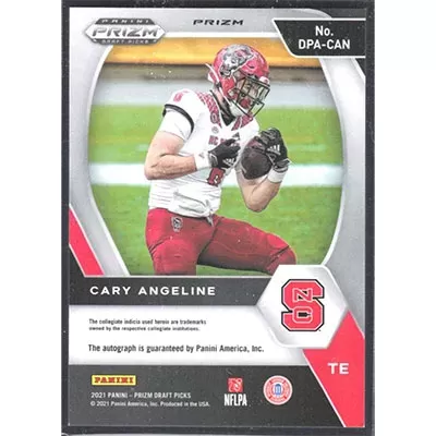 This is a 2021 Panini Prizm Draft Picks Collegiate Autographs Orange Ice Cary Angeline autographed football card. This card has been signed, in blue, by Cary Angeline, and is guaranteed authentic by Ballcardz.com. The card is #DPA-CAN and pictures show condition.